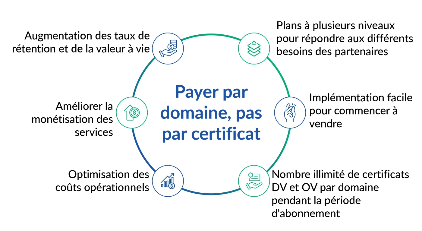 Protégez votre stratégie de certificats DV et OV, payez par domaine, émettez sans limites, automatisez et développez sans contraintes.
