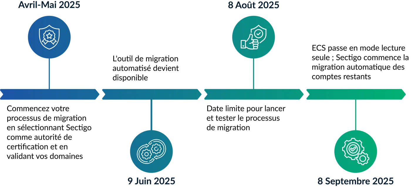8 septembre 2025 : ECS passera en mode lecture seule, désactivant ainsi la délivrance de nouveaux certificats et les modifications de compte. Veuillez terminer votre migration avant cette date afin d'éviter toute interruption.